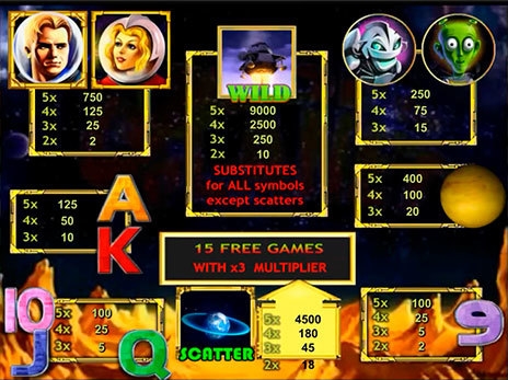 Кроме того, на вращающихся барабанах можно встретить номиналы игральных карт, симпатичного землянина, его юную белокурую спутницу, инопланетное существо. Именно эти картинки помогают формировать выигрышные цепочки.
